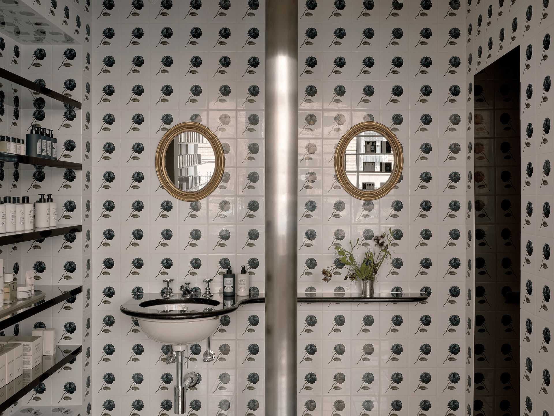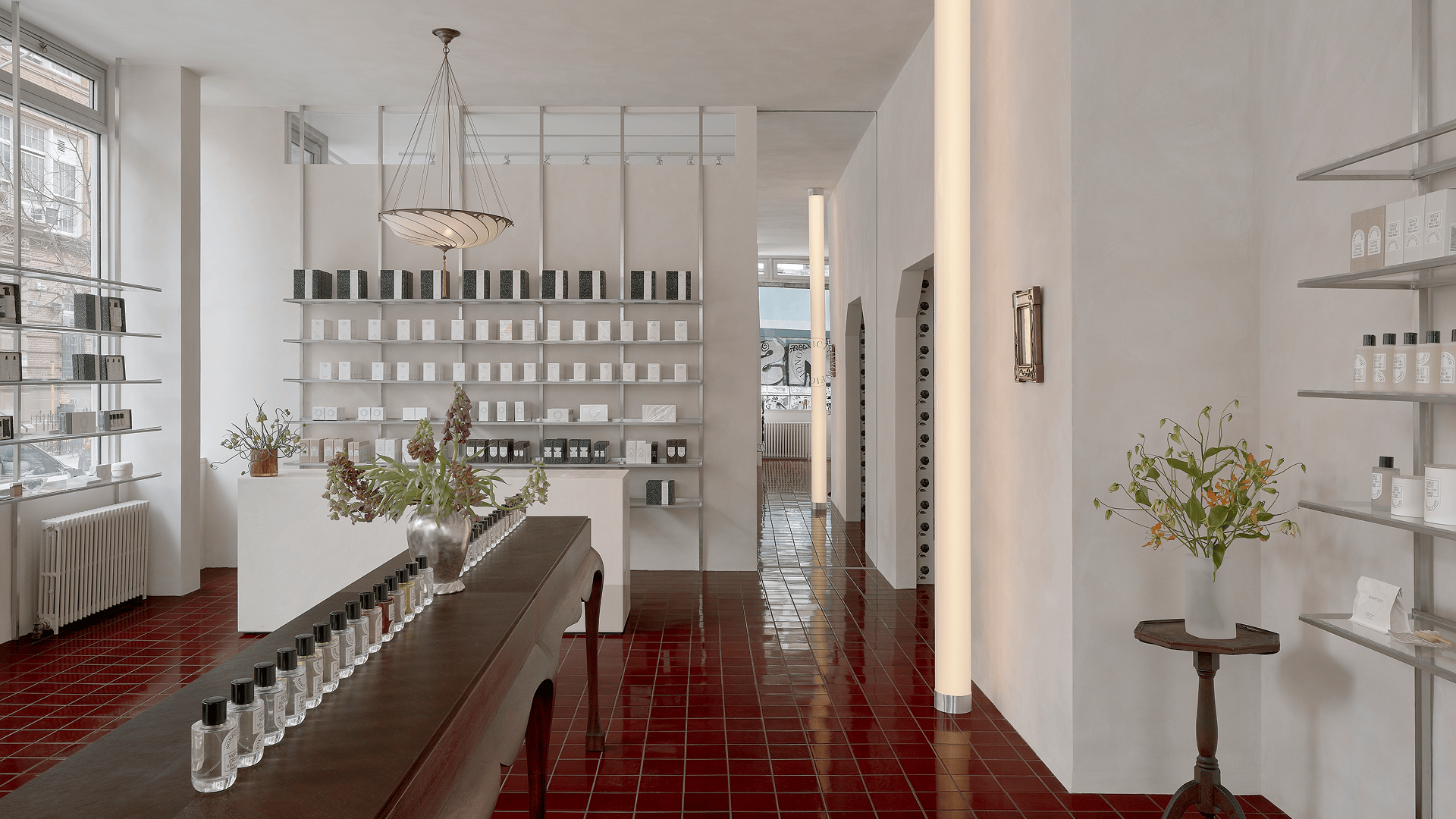 Designed in collaboration with architecture and design studio Charlap Hyman & Herrero, the space reflects both the energy of the city and our approach to reflection and sensory experiences. Limewashed walls and glossy oxblood-tiled floors set the tone, while a tiled niche featuring a hand-painted black rose — a custom artwork by Pilar Almon — anchors the space. Geometric forms and warm, ambient lighting further shape an immersive environment that balances clarity and depth.